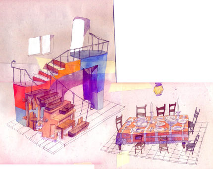 Imatge de l’esbós escenogràfic per El casament d’en Terregada, del Teatre Nacional de Catalunya.