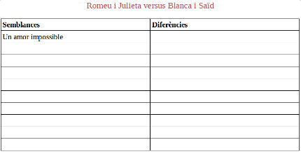 Quins paral·lelismes i diferències trobeu entre el drama amorós de Romeu i Julieta i el de Saïd i Blanca? Obriu un debat a classe i després en dues columnes enumereu els principals.