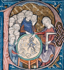 Peu: Miniatura d’una dona ensenyant geometria (segle xiv)